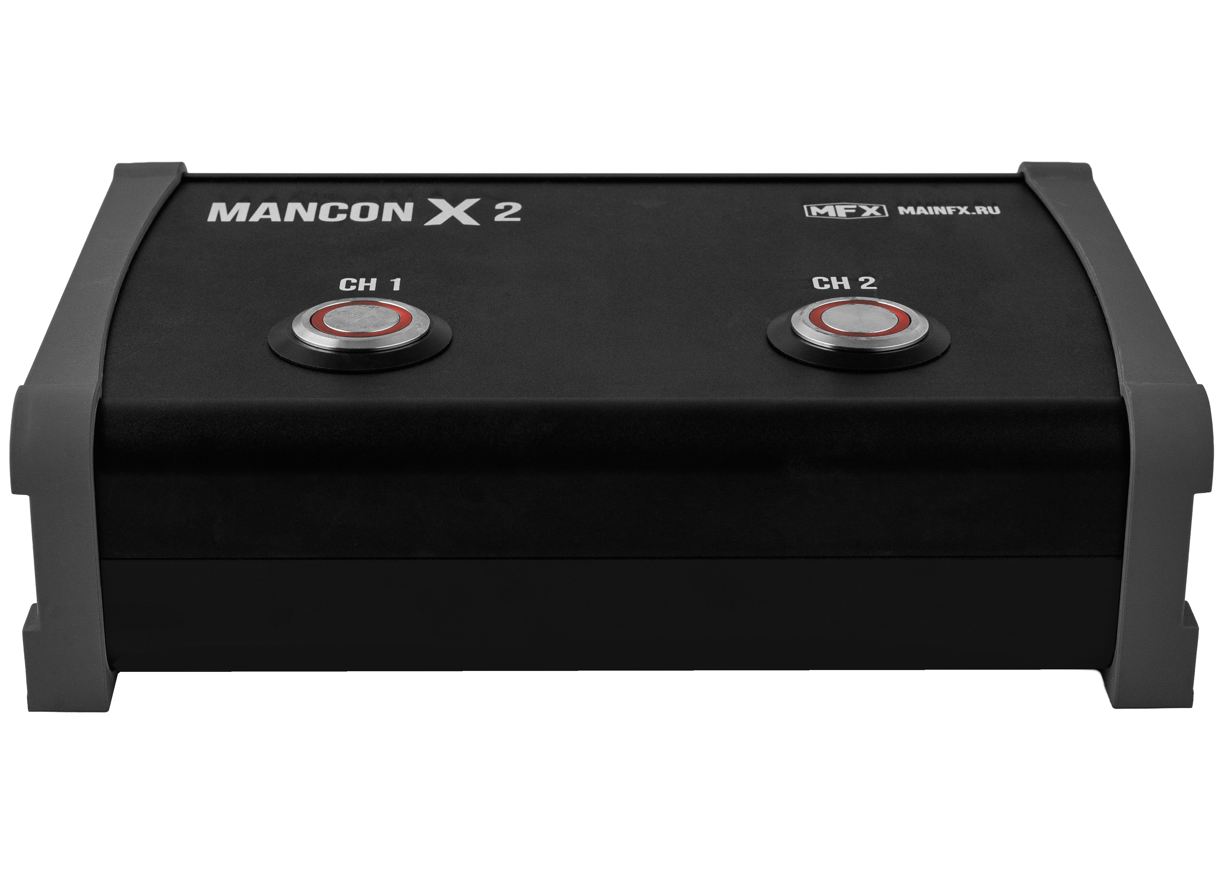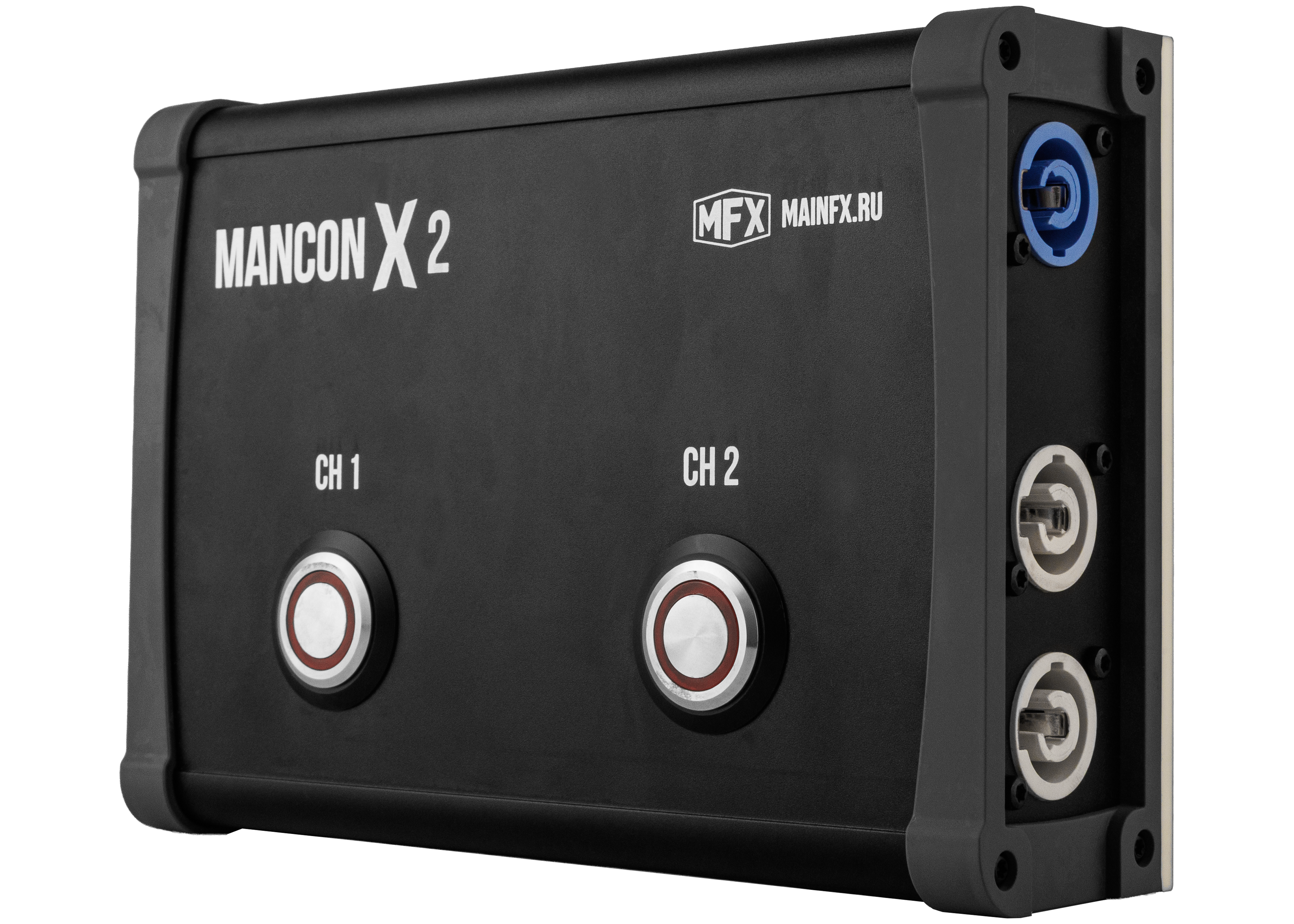 MANCON-x2 is a two-channel push-button controller in a compact enclosure with two built-in relays. It is designed for direct control of two 110–230 V loads. Each channel is activated by a separate button, and equipment is connected via Powercon connectors. The load capacity is up to 16 A per channel, with a total current not exceeding 16 A. The enclosure protection rating is IP44. It is ideal for operating the CO2JET heavy fog generator as well as streamer machines.
